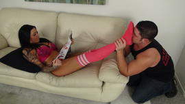 Mar 16 - Lucky slave gets to bury his face in Austin's sweaty socks and inhale their aroma and then lick and suck them while she is ignoring him and reading a magazine.