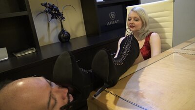 Mar 18 - Mistress Trinity humiliates ladies floor by ordering him to crawl on the floor to her feet and then lick her tennis shoes.