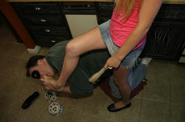 Oct 27 - Mistress Brandy helpfully lifts her foot for the benefit of her slave so he can clean her toes with his tongue